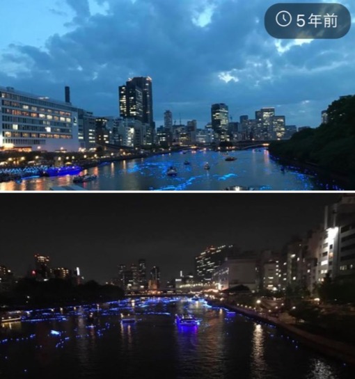 写真は5年前の天満橋と天神橋から見た大川の景色です。
