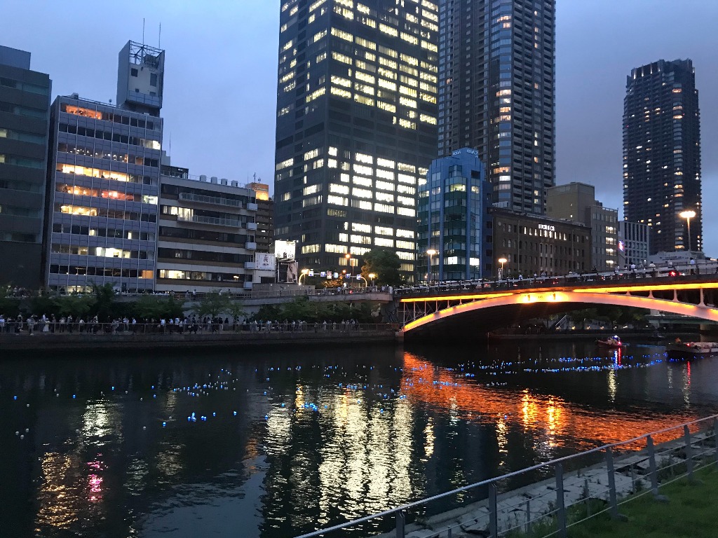 天満橋と天神橋の間の大川に、青いボールが漂う天の川伝説。