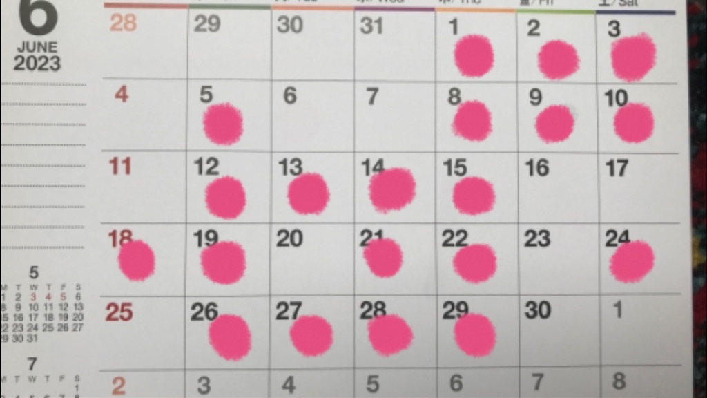 6月の予定です。ピンクの○が営業日です。お気軽にお問合せください。